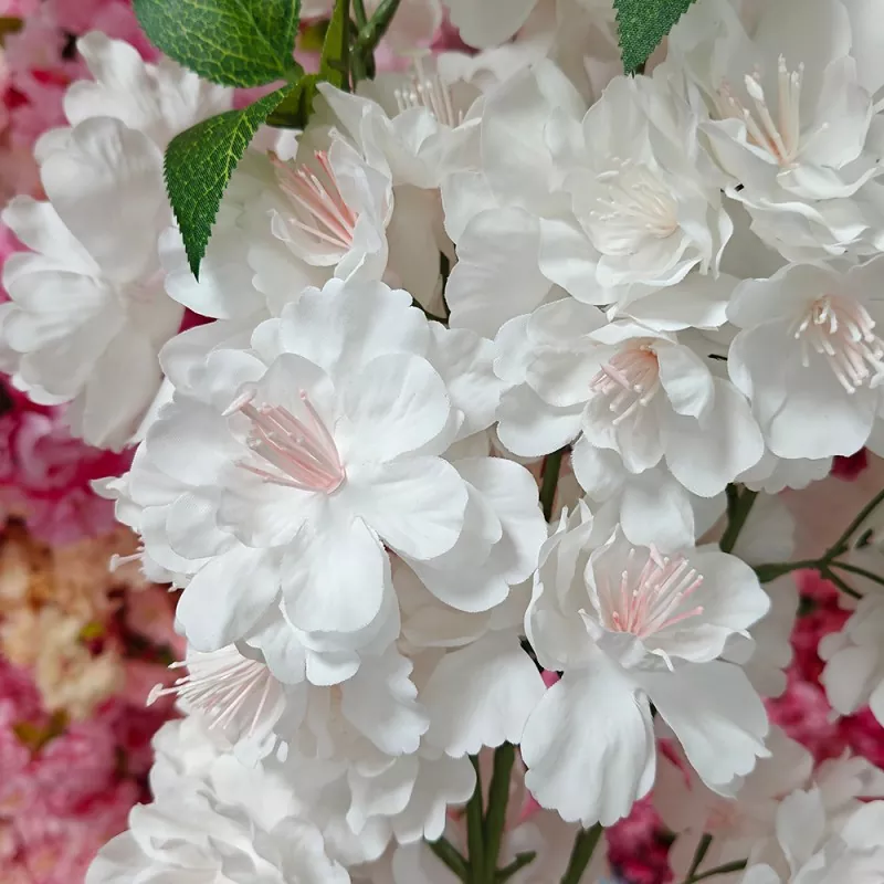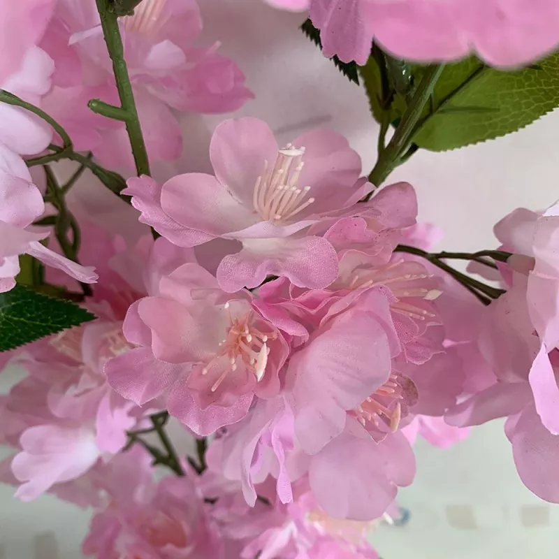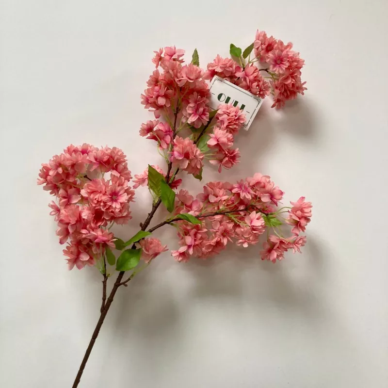 Bu yapay kiraz çiçeği dalı, çoklu çiçek çatalları ve dört set yeşil yaprak içerir ve uyumlu ve zengin bir katman oluşturur.
